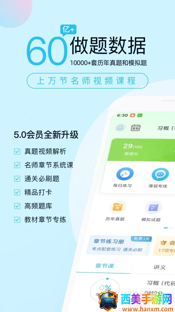 自考万题库是百万考生提分的最佳选择。它汇集海量试题,覆盖多学科多专业类别,让你随时随地复习练习。提供准确答案解析和错题订正功能,助你理解知识点、纠正错误。新大纲免费题库全收录,免费视频学习方便离线下载,全天免费直播由大神讲师轮循在线,VIP助教督导伴读,真人客服实时解决问题。利用人工智能算法智能出题,还有互动式欢乐直播等,科学通关,是自考学习的得力助手。