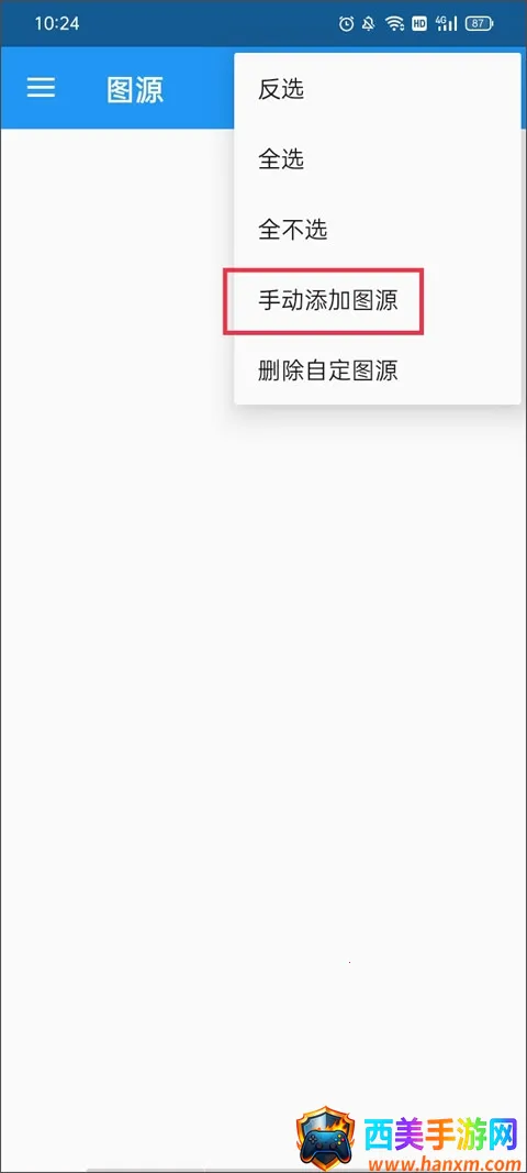 3、这里会显示所有的图源网址,点击右上角的三点图标并点击手动添加图源。