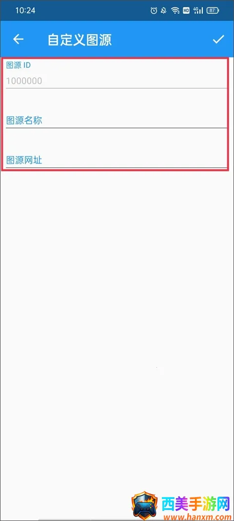 4、输入图源ID、图源名称、图源名称以及图源网址,最后点击右上角的对钩。