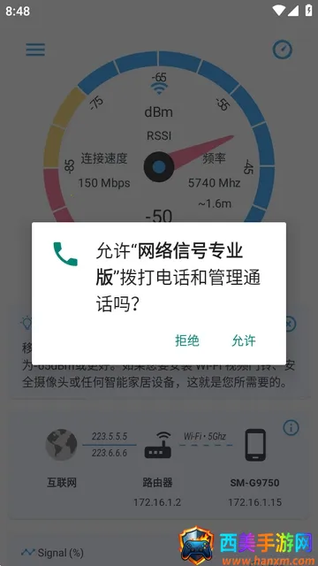 它的功能超丰富,能随时随地一键查看网速状态,让信号强度不再是秘密。支持流行国际网络标准,提供各层协议网络级信令解码。具有多种测试功能,像GSM、EDGE等格式的实时信令解码都不在话下。还带来丰富兼容性,适配全球网络标准。使用时,下载安装好获取应用权限,允许电话管理权限,打开就能查看wifi信号强度,也支持查看手机流量信号,点菜单还能查看信号信息和设置,可按习惯设置显示效果。有了它,就能轻松解决网络信号弱的问题,多维度评估无线信号质量,让你随时了解家中真实网络质量状况,上网更顺畅。