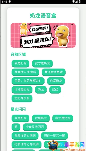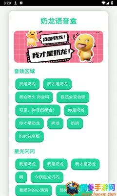 奶龙语音盒优势显著。通过一次点击,就能在日常聊天、玩游戏或社交媒体交流中轻松使用。多场景适用,不管何种聊天场景都能完美适配,大大提高了程序实用性。而且完全免费,所有内容任由用户随意使用。其可爱有创意的语音包,以小奶龙为主题,声音丰富,界面直观易操作。热点内容紧跟潮流,还有自动播放、循环播放、收藏等功能,一键操控简便,能很好满足更多用户需求,是款不可多得的语音盒软件。