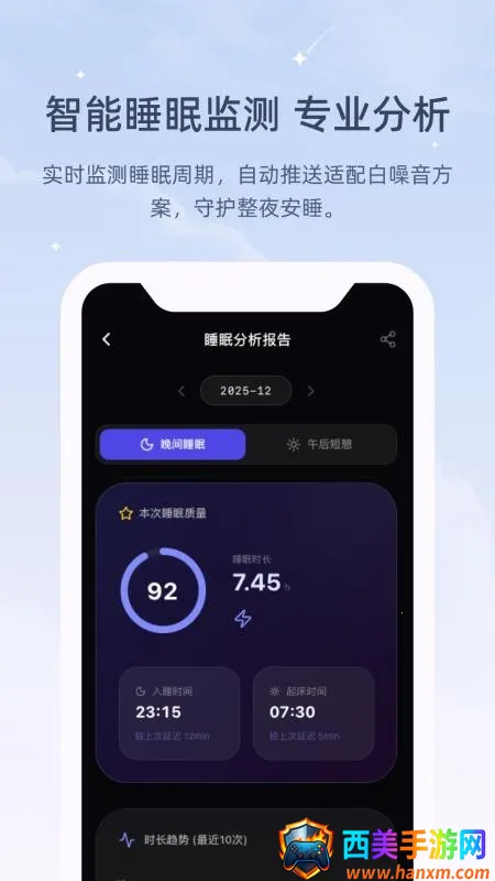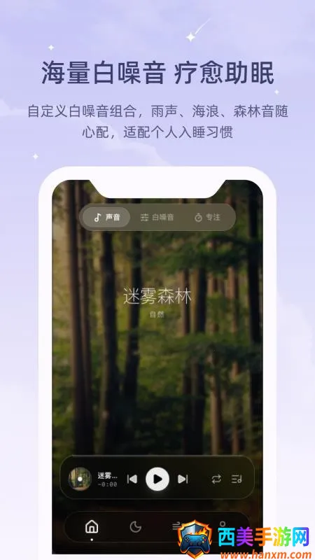 4. 睡前打开 app 能杜绝干扰,享受沉浸式助眠过程,还会自动推荐多种音效,甚至能按喜好生成专属音效,每天睡眠数据清晰呈现。