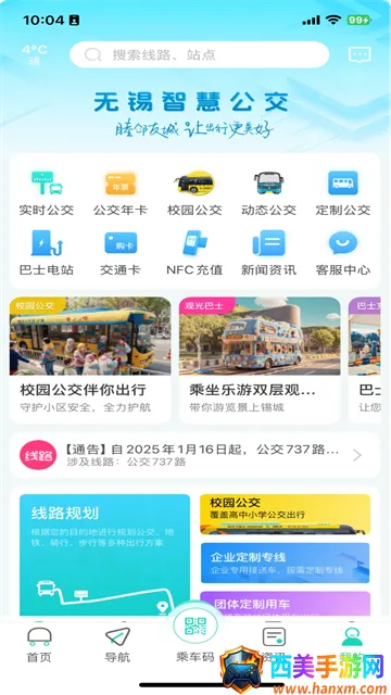 无锡智慧公交APP能轻松解决你公交出行的各种问题。它功能超强大,打开就能看到附近公交站点,搜索一下能快速找到任意站点。线路查询超方便,坐哪路车、车往哪开、经过哪些站都能查到。还能精准预报车辆到站时间,实时查看位置,不用在站台傻等啦。这里还有本地生活资讯和失物招领服务。充值也简单,启动APP点按乘车码,再点去充值,挑选金额点按充值就行。有了它,你能随时掌握公交出行信息,合理规划行程,告别盲目等待,让出行更便捷高效。不管是日常上下班,还是出门游玩,它都是你的贴心公交出行助手,让你的城市生活更省心。
