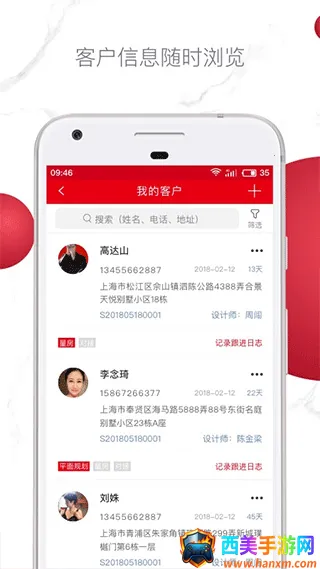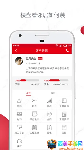 4、多样功能助力:有自行选择客户详情、轻松工作台、客户信息随时浏览、装修办公进展掌握等功能,还包括项目跟进、工程预算、客户搜索等软件功能,为工作带来诸多便捷。
