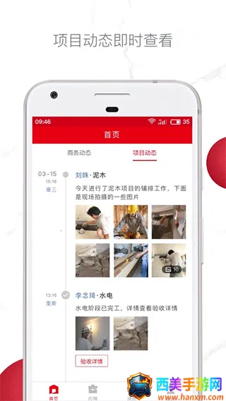 2、动态实时查看:支持随时查看商务动态和项目动态,能快速看到验收详情、户主信息等,还可关注客户动态及浏览日志记录。
