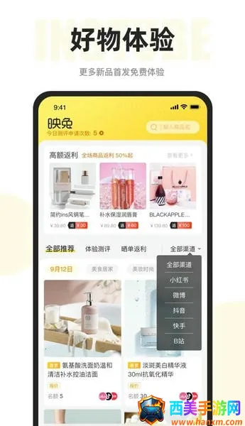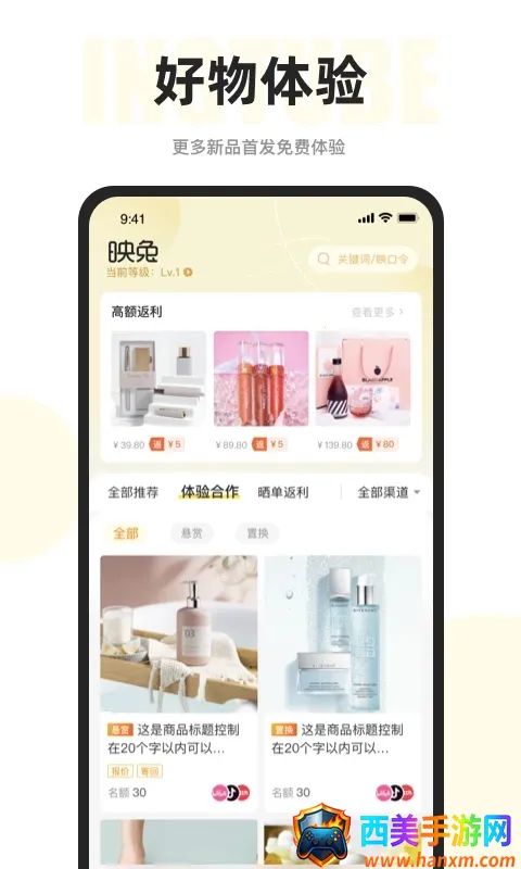 映兔备受年轻人和品牌青睐。它倡导人人都是体验官,让用户能分享真实产品体验。在这里,不论你是何种身份,只要热爱生活美学,都能找到共鸣。用户可积累话题热度与内容资产,分享消费心得。每周有优质产品供体验,还有试用价和返利现金,实现0元试用全额返利。能申请体验、参与置换和悬赏测评,享受海量品牌体验,提供探店打卡等福利,为用户打造共享体验互动交流平台,带来更多乐趣与回报。