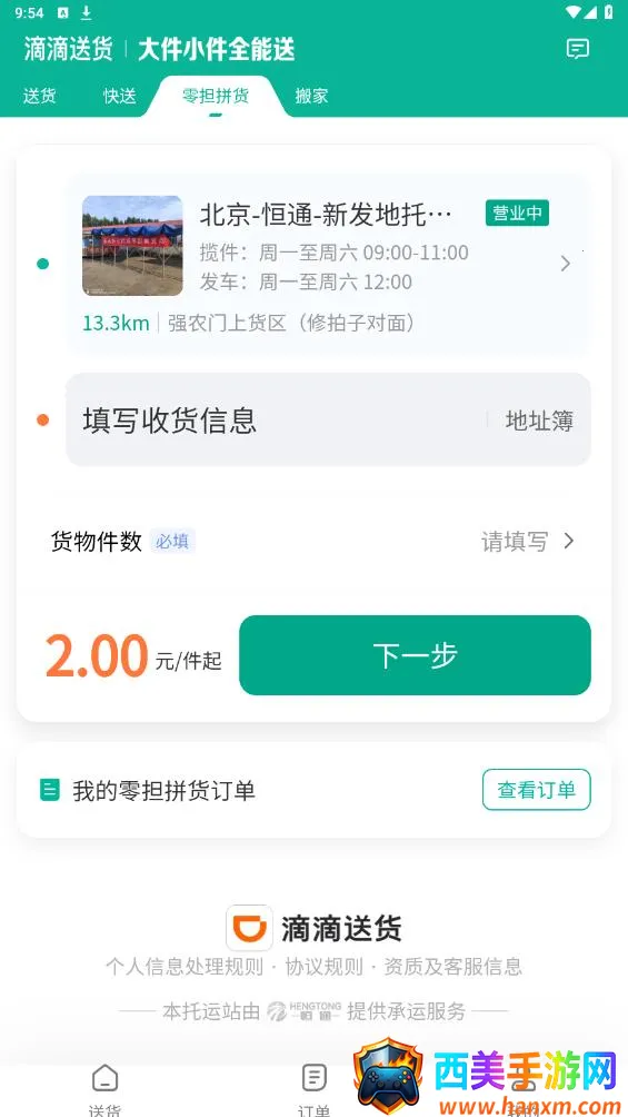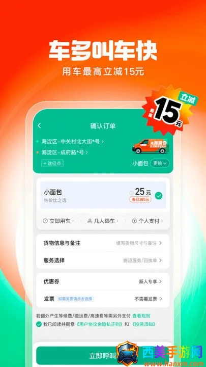 使用时,先阅读并勾选用户协议,进入主操作界面。然后填写发货地与收货地址,系统会自动匹配可用货运车辆。还能根据货物体积与重量,筛选合适吨位与尺寸的货车类型。它不仅能完成常规货运,还能委托车辆完成短途跑腿任务,像小件配送与货物取送都不在话下。