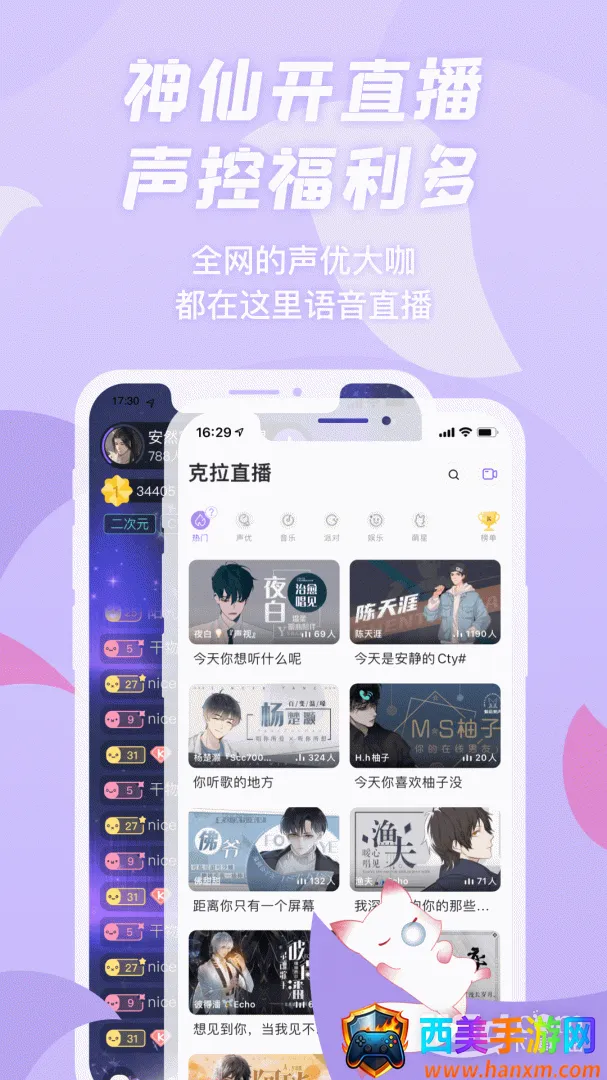 声优互动超有趣:全网众多声优大咖在此语音直播,像阿杰、夏磊等,能和喜欢的主播连麦互动,还有暖心主播陪聊天哄睡唱歌。