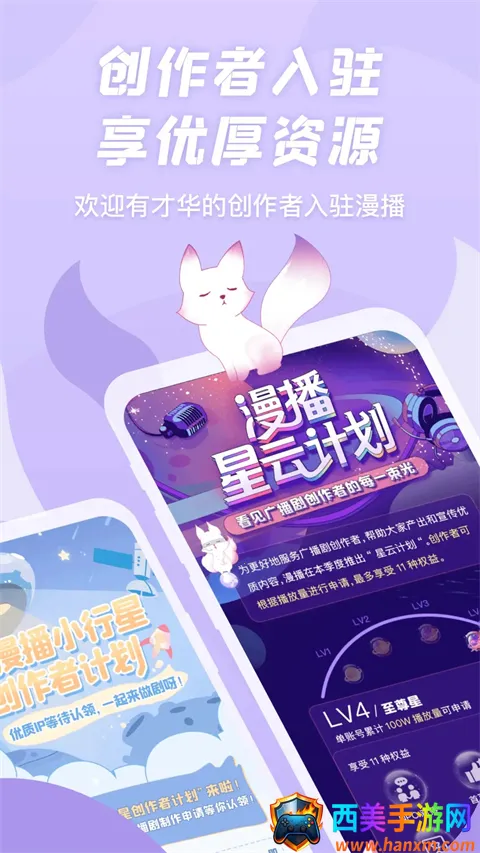 4. 助力创作者发展:欢迎有才华的漫播剧创作者入驻,优质作品可享受站内推荐、微博推广等资源福利。