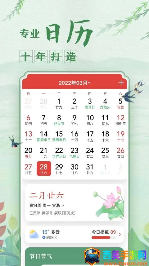 中华万年历是一款备受欢迎的日历应用。它功能丰富,涵盖农历黄历查询、天气信息、日程记事提醒等。其界面设计清晰,操作简单易上手。不仅能准确展示节假日、农历节气、黄历宜忌,还同步提供天气趋势与空气质量数据。支持多端同步,方便用户随时随地管理时间。而且提供免费云服务,让用户享受便捷体验。无论是日常查看日期,还是安排重要日程,它都能满足需求,为生活带来诸多便利,是一款非常实用的日历软件。