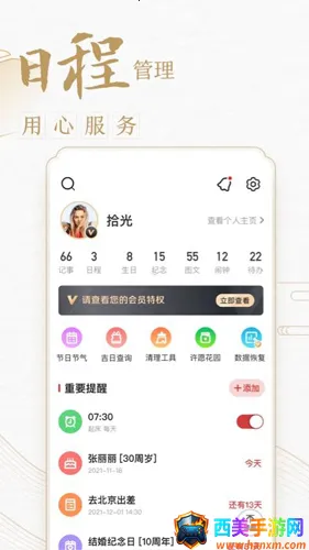 中华万年历优势显著。界面极简高效,支持经典月历周历等视图切换,主题可自定义更换。实用工具丰富,聚合星座运势、吉日查询等多种贴心工具。日历天气一体化,完整展示节假日、农历节气等,并同步天气数据。智能语音与全平台同步,支持语音输入、笔记提醒,数据云端备份,多端同步。还拥有同城生活社区,每日推荐精彩内容,支持个性化订阅各类信息,给用户带来全方位优质体验。
