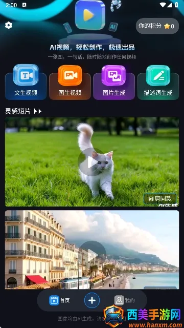 4、任意选择一种功能,例如文生视频,点击进入。请输入你要生成的视频内容,或参考下列的示例,然后点击生成视频即刻就能获得视频