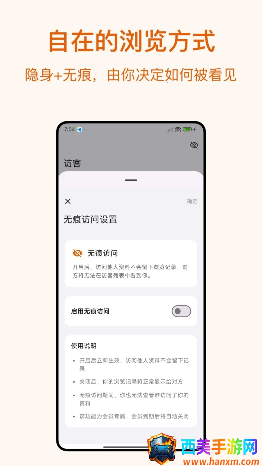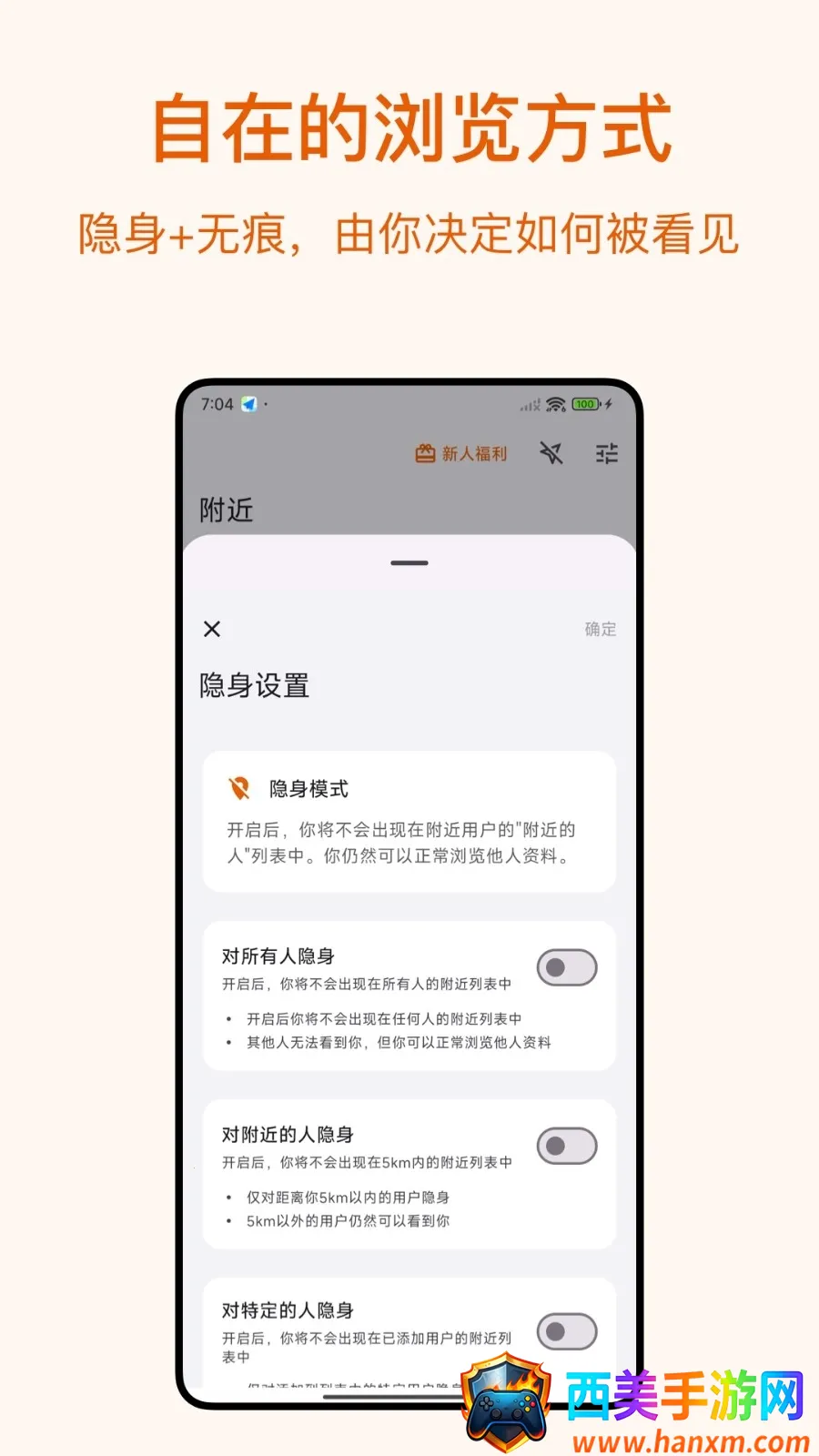 拥有隐身模式,当你想静静时,开启此模式,自己能看别人,别人却看不到自己,可自由选择社交与否。