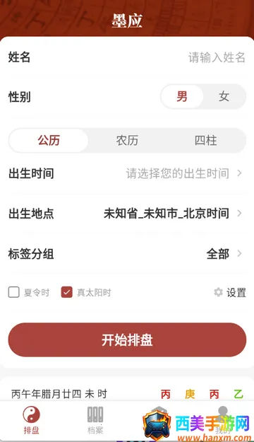 2、进入软件排盘页面,输入你的基本信息即可开始排盘