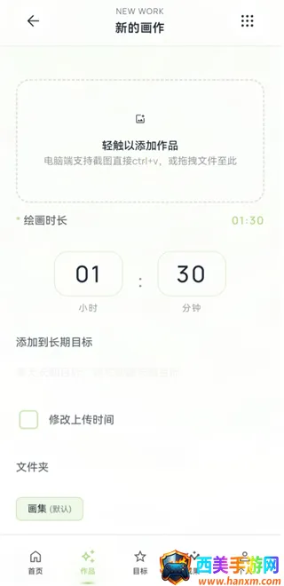 2、点击上方虚线的区域添加作品,你可以设置绘画时长。