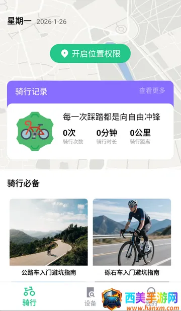 2、进入首页,可查看骑行记录,骑行必备等功能