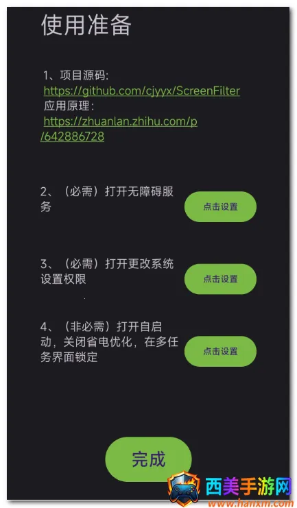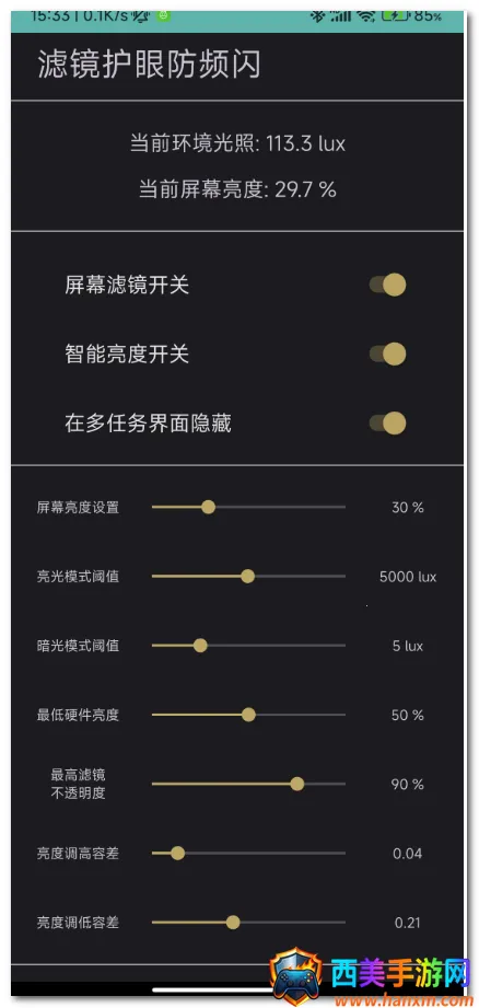 滤镜护眼防频闪应用针对OLED屏手机,通过控制屏幕亮度、添加黑色滤镜实现低亮度低频闪。支持拖动状态栏亮度条,环境光照变化会自动调整。最低安卓10,开发时未考虑兼容性,开启滤镜勿开系统纸质护眼,还介绍了各项设置。