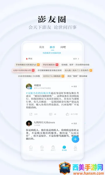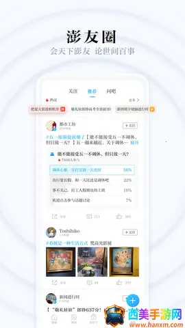 澎湃新闻优势显著。它是专注时政与思想的媒体开放平台,聚合优质时政思想类内容,时政聚焦精准深入,能让用户及时了解国家大事和发展动态。原创内容品质卓越,由专业团队输出,保障信息真实可靠。思想争鸣氛围活跃,激发用户思考讨论。视频专区特色鲜明,带来丰富视觉体验。此外,还有高质量问答社区、汇聚专业创作者的澎湃号等,为用户提供多元精彩内容,满足多样需求。