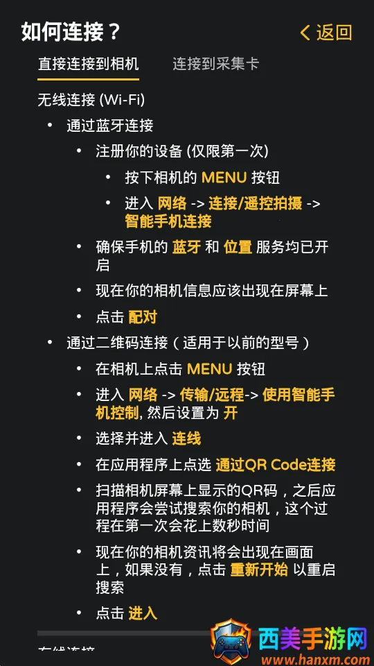 1、连接方式多样:支持通过wifi或者usb控制,还能通过蓝牙连接,如适用于Sonya7IV、FX3等型号,且有详细的连接步骤说明,无论是无线、蓝牙还是有线连接,都能快速实现手机与相机的连接。