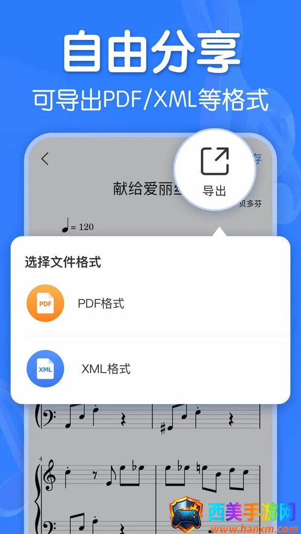 3. 支持多种导出格式:支持导出MusicXML、pdf等文件格式,可以分享给好友或其他懂音律的App等,方便实用。