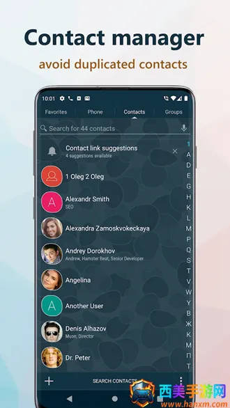 这款软件拥有一体化联系人管理中心,所有联系人集中呈现统一编辑,支持按账户分层管理。强大的智能建议系统,可自动识别重复联系人合并相似条目,并推荐最优分组方案。还支持一键导入导出,自由创建与编辑联系人分组及收藏夹,快速筛选高优先级对象。