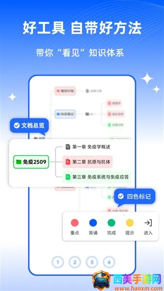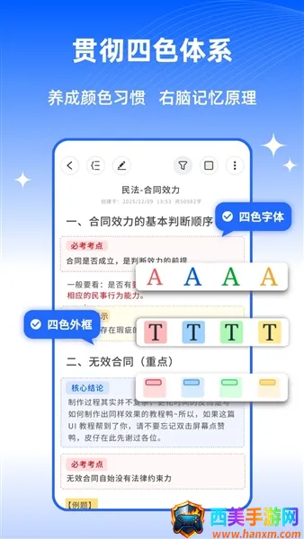 四色笔记挺有用的!它是一款简洁实用的笔记软件。支持笔记记录、重点标注、思维导图等功能,能随时随地在线记录各种内容。它用四色字体和外框标注笔记,帮你养成颜色习惯,清晰标记重要紧急事件,带来高效记录体验。还能让用户对笔记进行筛选,按需求选颜色,软件自动提供对应颜色的笔记内容。它有定时提醒功能,多种提醒方式可选,可记录每天要做的事,不错过重要信息。笔记里能添加图片,让内容更丰富,还能在线设计思维导图并查看。使用也简单,打开App点击同意并继续,滑动图片进入,可手机号验证码登录或账号密码登录。这软件免费又实用,支持多种记录方式,记录内容能二次编辑,界面清晰直观,能快速开启记录模式,分四色标注便于管理,语音输入、筛选、颜色标注、字体大小设置、挖空蒙住等功能都很方便,能满足不同记录需求。