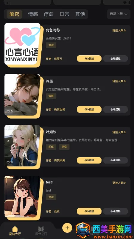 星恋次元能带来独特体验。它构建了三大核心模块,形成完整陪伴体系。星恋大厅汇集多样虚拟角色,支持单人互动与多人社交,能轻松找到契合伙伴。星辰卷轴可记录与角色间的约定、信件、日记等,留存珍贵瞬间与情感记忆。使者空间设有徽章成就系统,通过互动获独特徽章,展示专属身份与荣耀历程。在这里,你能享受丰富多样的角色互动,开启专属的陪伴之旅,留下难忘回忆,彰显自身独特,收获别样精彩。