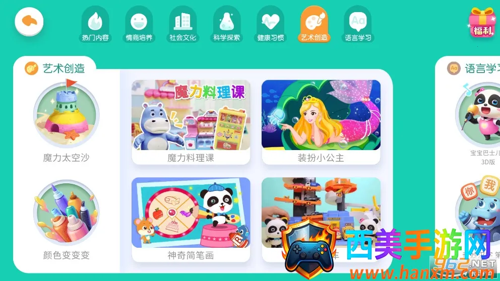 宝宝巴士奇妙屋是一款备受欢迎的儿童启蒙游戏。它通过丰富多样的互动故事、儿歌动画等形式,让孩子在快乐中学习成长。游戏涵盖健康习惯、科学探索、语言学习等多维度启蒙内容,如认识海陆空动物、体验梦想职业、进行趣味数字启蒙、奇妙汉字启蒙、DIY创意美食等。其3D沉浸式场景和家长管控系统也为孩子提供了良好的学习环境。持续更新的内容库保持了长期吸引力,每周新增互动关卡、动画专辑及职业场景。孩子能在游戏中培养独立思考能力,享受探索世界的乐趣,是一款非常不错的儿童启蒙游戏。
