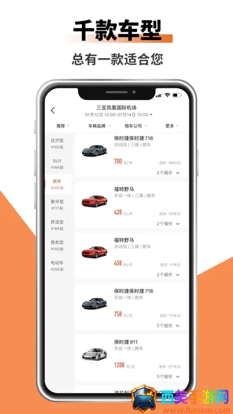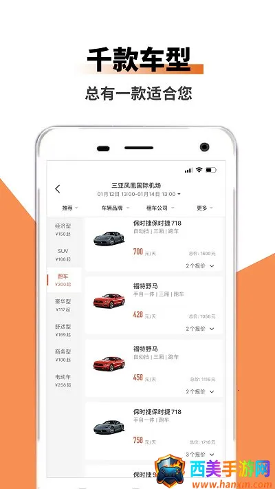 2. 车型丰富任你选:拥有千款车型,涵盖拉风豪车、商务车、经济舒适型车、SUV、新能源车、房车等,能满足短租、长租、商务行、自驾游、周边游、限行代步等多种用车需求。