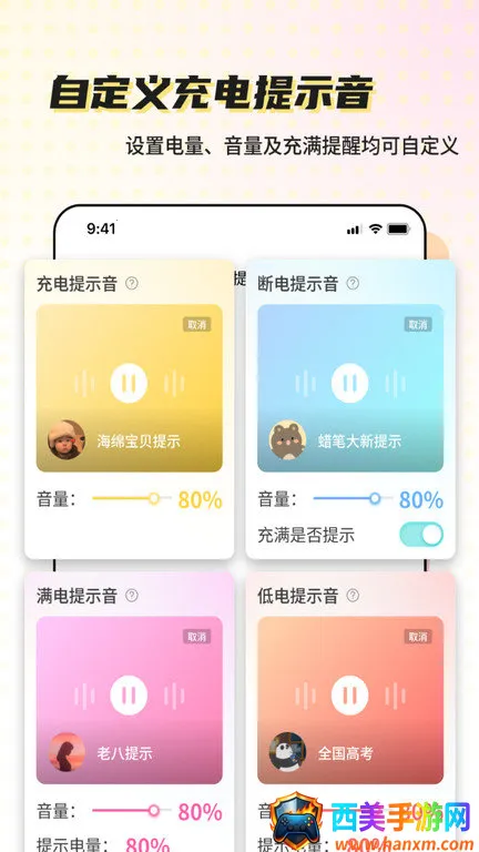 1. 海量个性化充电提示音:空空鱼提供明星声优、动漫角色、热门梗等多元风格的充电提示音库,用户可自由选择并自定义充电断电、充满、低电量等场景音效,还能录制亲友专属声音,让充电过程趣味十足且充满情感温度。