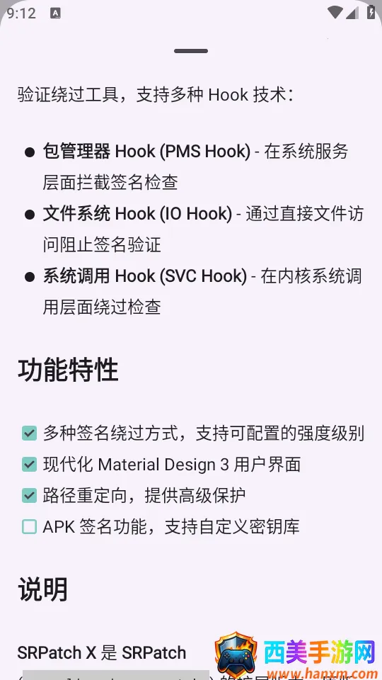 想找去签名校验工具的朋友们看过来!今天给大家介绍一款超棒的工具——SRPatchX。它基于SRPatch打造,是一款增强版去签名校验工具。打开就能免费使用,添加了apk签名功能,稳定性和兼容性大大提升,能在更多设备上用,操作超方便,还保留了原版核心功能。