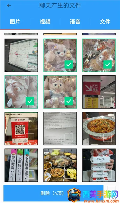 3、勾选需要删掉的图片,视频、语音和文件同理,然后点击下面的【删除】。