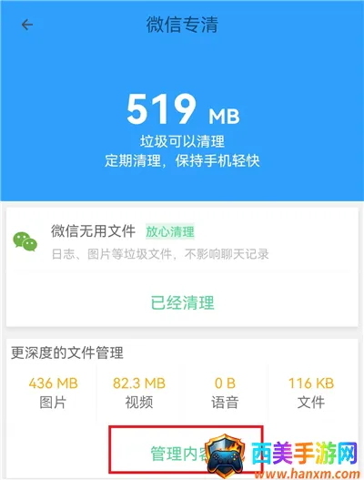 2、点击下方的【管理内容】,会清楚标注出图片、视频、语音和文件占多大的内存。