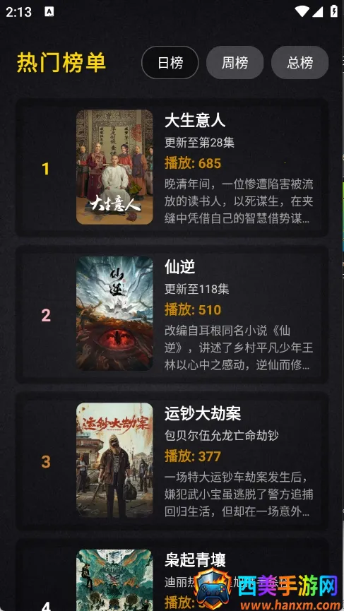 2. 设有日榜、周榜、总榜等多个榜单,能快速找到热门影视。还会依据观影历史和喜好精准推送,轻松发现新片。