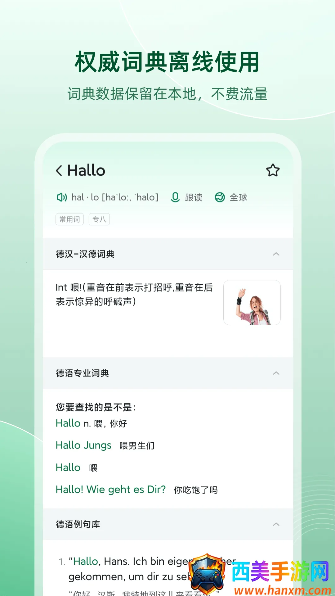 3. 海量例句助掌握,两百万句德汉对照,覆盖多种应用场景。
