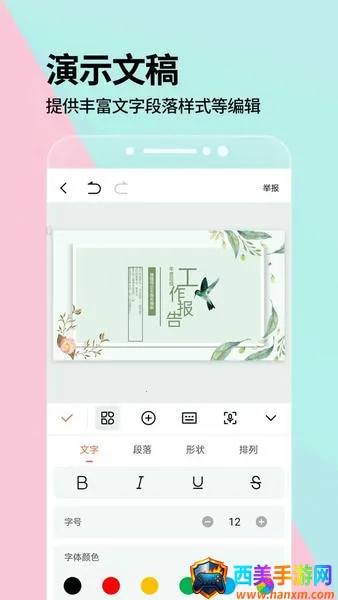 它为用户提供丰富应用素材,多样文字段落样式满足不同需求。多种模板类型一键套用,如ppt演示、word文档、excel表格模板等,制作文档更便捷。界面设计清爽简洁,色彩柔和靓丽,带来极致视觉体验。各种模板适用于多种场景,字体样式丰富可按需选择。还支持多种数据保存模式,保障数据安全,不必担心丢失。其功能多样,能兼容多种办公软件,节省设计办公成本,赢得众多用户认可。