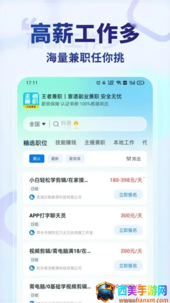 王者兼职优势显著。岗位丰富多样,覆盖多种行业,如本地附近职位、线上主播类等,适合各类人群。不管是学生、宝妈,还是上班族等,都能找到合适兼职。薪资日结有保障,主推日结岗位,在线客服及时响应,确保薪资准时发放。平台六重审核岗位,严格筛选,商家需上传认证和执照照片,经审核方可发布兼职,让真实岗位更靠谱,给用户优质兼职体验,助你轻松找兼职赚钱。