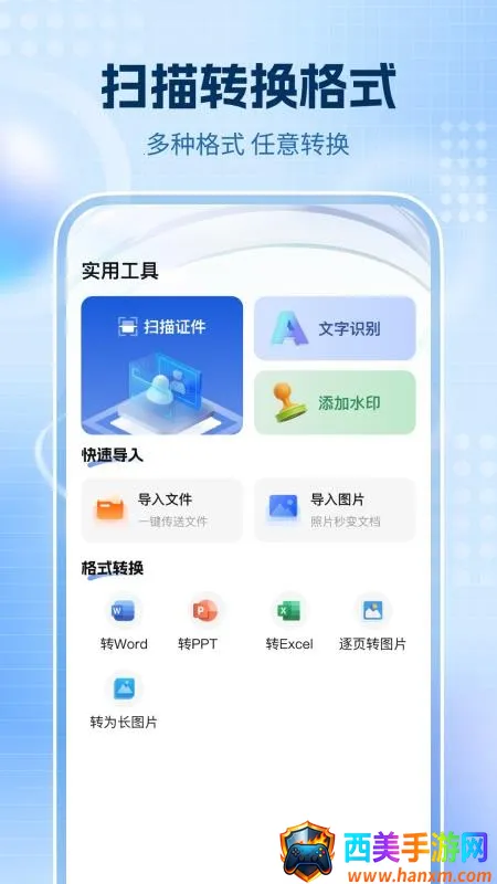 全通扫描王优势显著。它支持拍照、图片、证件、发票等多种扫描模式,智能化提取信息,操作便捷高效。兼容身份证、卡、营业执照等多种证件类型,精准识别,确保信息准确无误。一键拍照就能快速识别图片文字,功能全面,操作简单直观,轻松提取所需信息。还支持扫描并翻译各类文字图片,涵盖多种语言,满足多样化需求,无论是学生、设计师、商务人士还是旅行者等,都能凭借它高效完成各类文档处理与信息获取,极大提升工作和生活效率。