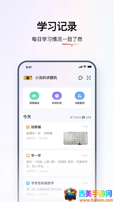 1. 家长可远程管控,轻松实现陪伴式学习。通过app连接设备,随时随地了解孩子学习情况,对学而思学习机应用商店内的APP进行管控,还能查看孩子学习动态和学情报告,让家长放心。