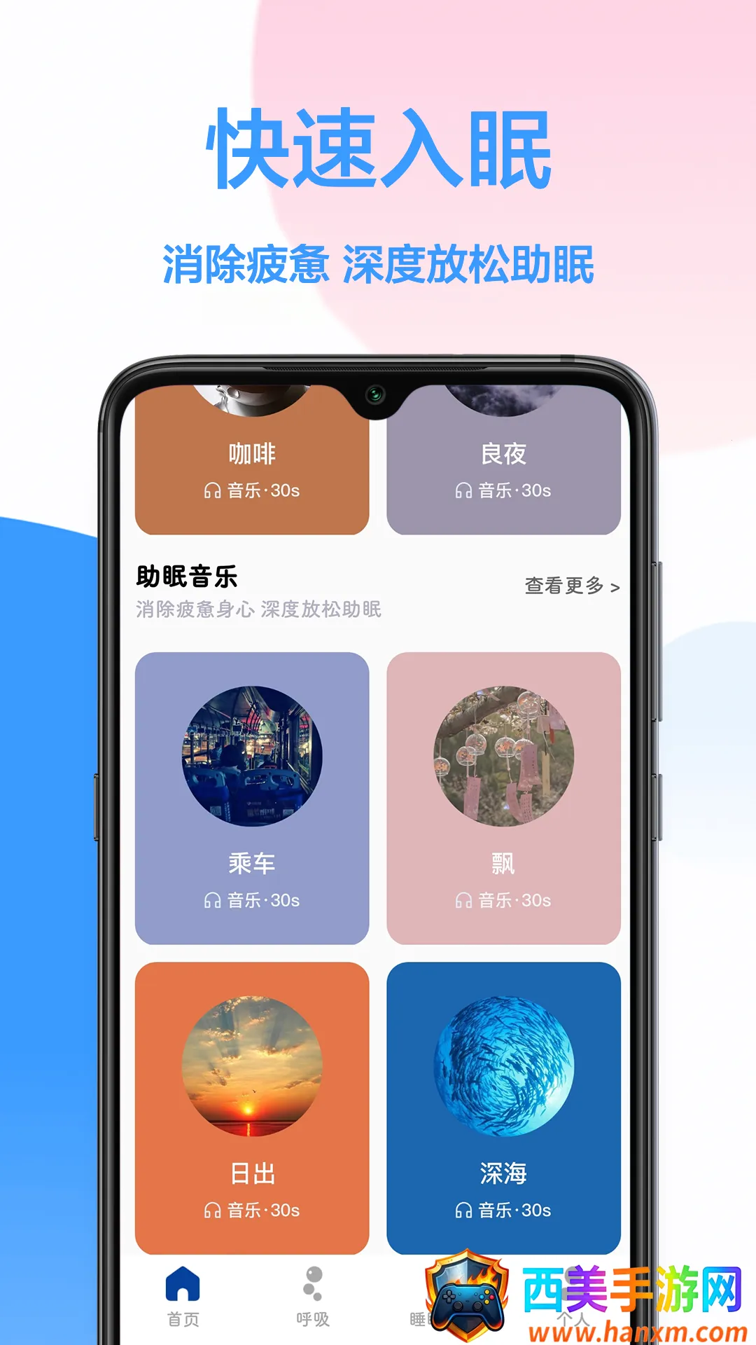 2. 多样舒缓助眠:提供各种舒缓的音乐以及呼吸练习,帮助用户更好地放松和入睡,还有闹钟功能助力起床。
