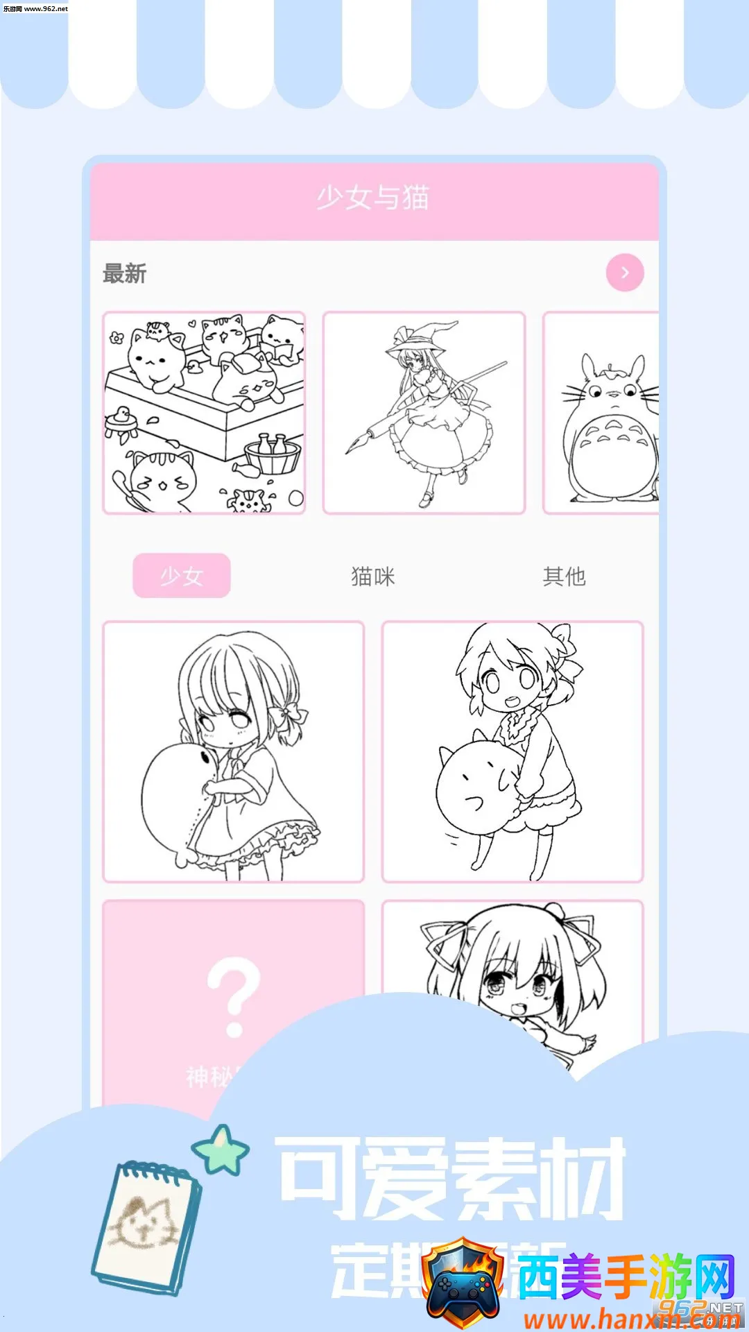 如果你正在寻找少女与猫壁纸,那少女与猫这款软件绝对能满足你!它是一款超棒的绘画填色软件。这里有诸多绘画资源,随时能开启自由绘画体验。准备了多种绘画颜色,各种精美可爱的素材资源也超多,能轻松找到并选择。