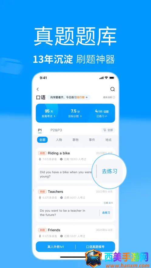 雅思哥口语题库,是雅思备考的得力助手!海量真题分类呈现,试卷题型、话题情景清晰梳理,让你刷题更有针对性,提分更有保障。在这里,能获取全球雅思考场试题实时回忆,高频话题清单助你考前精准准备。每日专属任务推送,搭配典型范文示例与齐全口语答案,助你早日和雅思分手。还有精彩雅思资讯,时事热点、难点考点干货满满。众多雅思大牛每周课表,按需选课预约上课,线上互动让学习不再枯燥。留学社区提供优质服务,学长学姐免费答疑,分享实用干货。你可以随时查看全国所有考场及考试时间的考题资讯。通过它练习口语超方便,进入练习页面点击口语选项,听录音、看原文后即可答题,还能听考友录音互相点评。想轻松备考雅思,就赶紧来试试雅思哥口语题库吧!