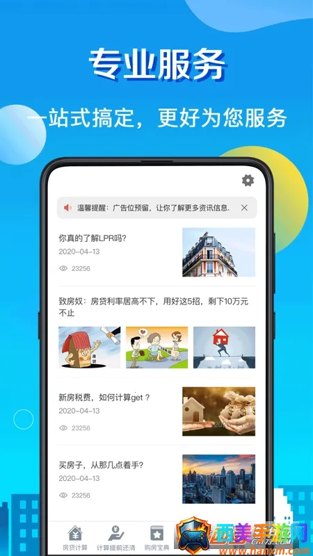 房贷LPR计算器为购房者提供了极大便利。它能帮助用户清晰把握房贷相关信息,致力于提供真实权威的情报。不仅能即时了解国家和各地区房贷新政新规,还能同步全网热点买房资讯。计算方面,操作简便,输入金额就能快速算出每月所需金额。支持多种贷款方式,如商业贷款、公积金贷款、组合贷款等,以及等额本息和等额本金两种还款方式。提前还款计算也很实用,有一次性提前还清和部分提前还清等方式。此外,还提供丰富的购房资讯、流程等内容,省去购房者查找资料的时间,是一款功能强大的房贷计算工具。