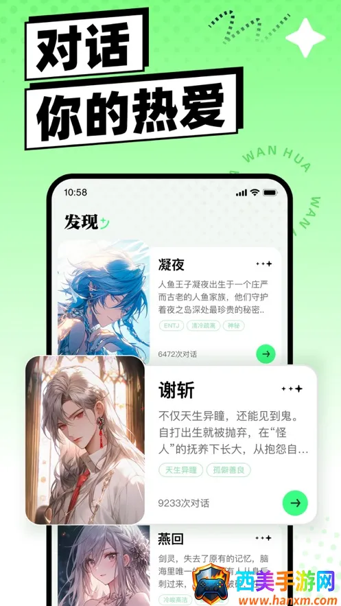 万话app是一款超有趣的智能聊天应用。它能借助大语言模型和图像生成模型,帮你生成各种个性独特的虚拟角色,还能为角色添加有趣设定。当你遇到“万话为什么一直显示没网”的问题时,别担心。万话的趣味对话演绎功能超棒,不管是仙侠权谋,还是都市科幻,AI虚拟人都能和你在不同时空展开精彩故事演绎,让你沉浸其中。而且你还能浏览其他用户创建的公开角色,找到感兴趣的就开始对话。它致力于打造万物皆可对话的概念,辅助创造多元虚拟角色。有了它,能解决你聊天单调的问题,随时随地享受趣味对话体验,给你带来前所未有的聊天感受,让你的交流更加丰富多彩,轻松摆脱网络显示异常带来的困扰,尽情享受与虚拟角色互动的乐趣。