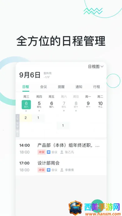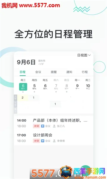 3、会议轻松有序:全新模式会议管理,可预定会议室、发起会议、进行会议签到;日程通知能新建且到位,工作待办有多重提醒,让开会更轻松。