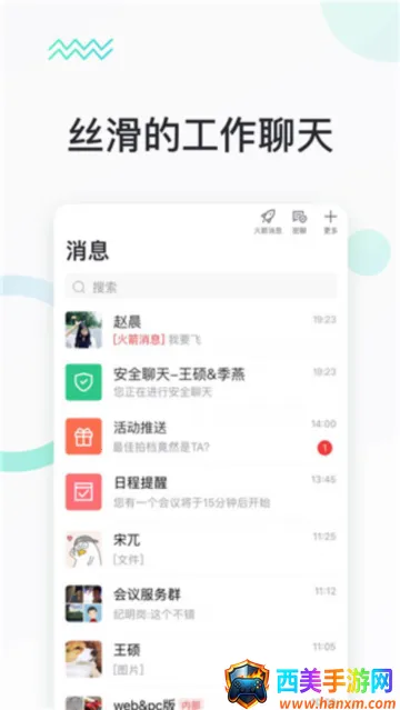 1、沟通便捷高效:企业通讯录无需重复添加,5 秒快速找人;火箭消息可加急通知重要信息,支持查看已读未读;安全聊天加密全程匿名,阅后即焚不留痕迹。