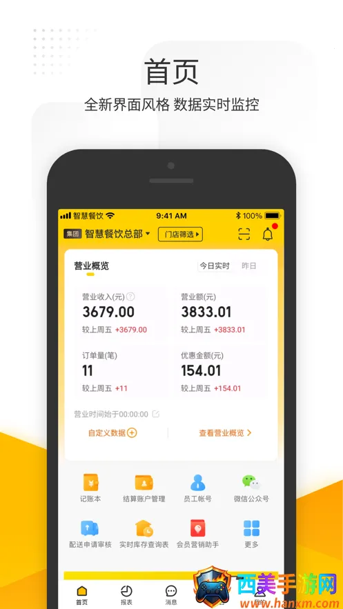 而且操作简便,数据一目了然,能随时查看店铺实时数据,配置多功能满足餐厅需求,消息模块可查看系统最新动态,报表丰富提供详细数据统计。用它管理店铺,轻松又高效!