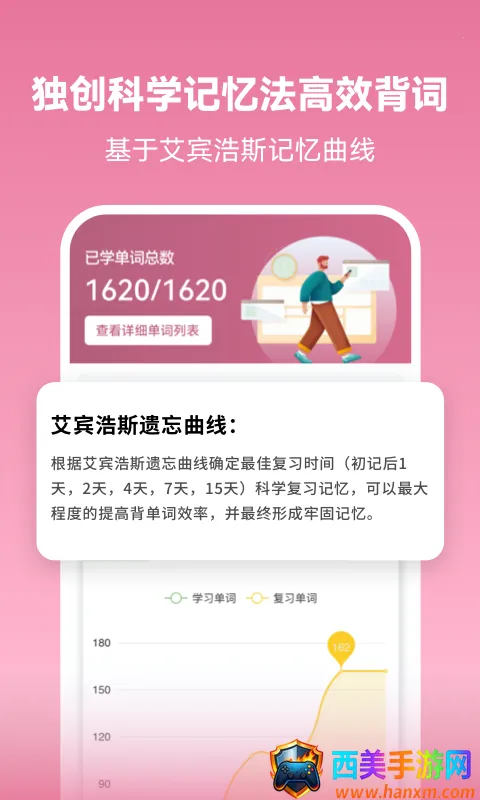 1. 科学背词算法,基于记忆曲线智能安排复习频率,有效对抗遗忘,提升长期记忆效果。