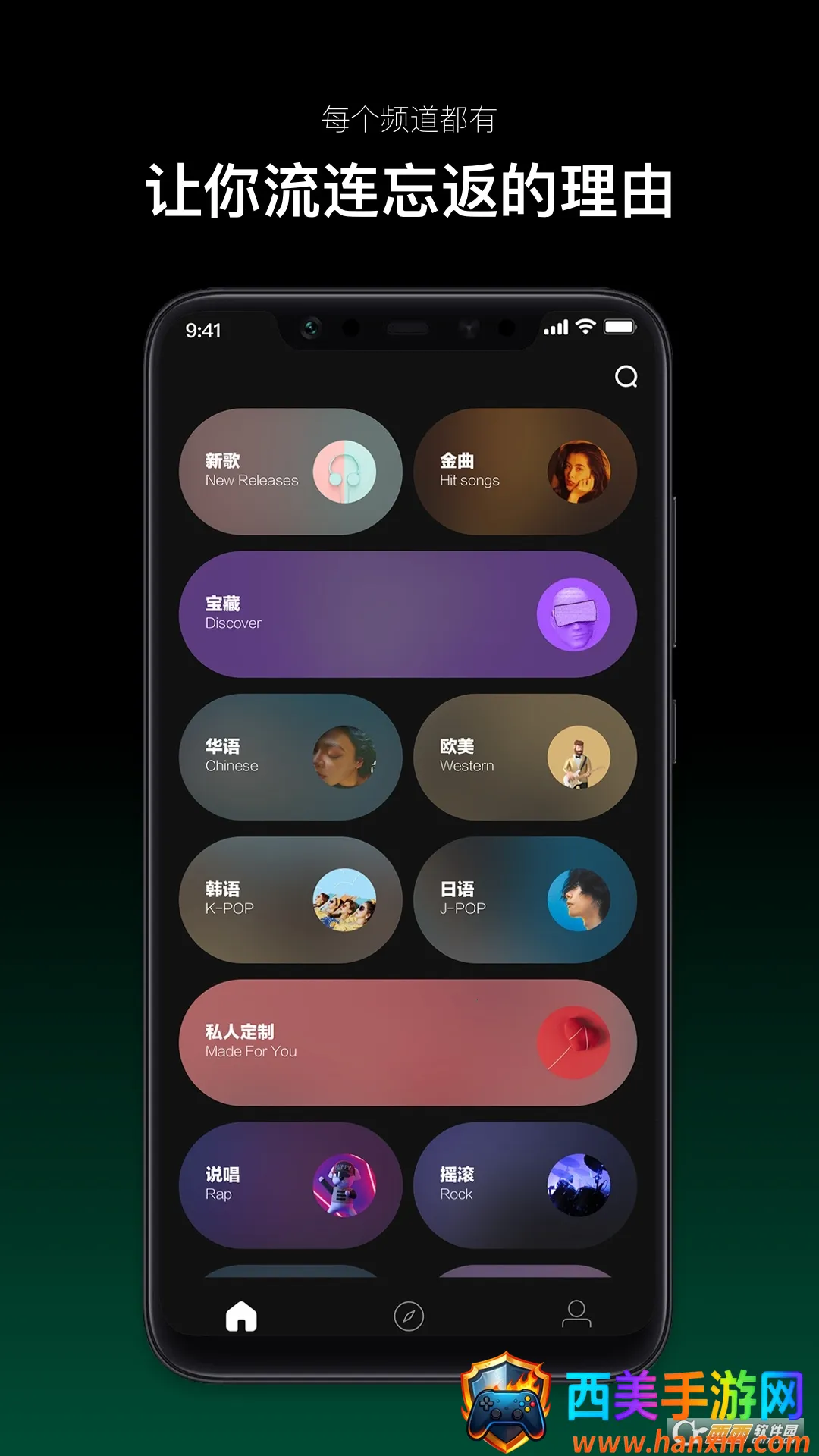 4. 界面超炫,UI简洁不失格调,带来畅快的体验,无论是欧美、华语、韩流还是日系音乐,都能满足用户口味与需求。