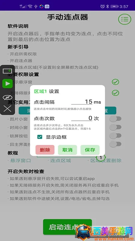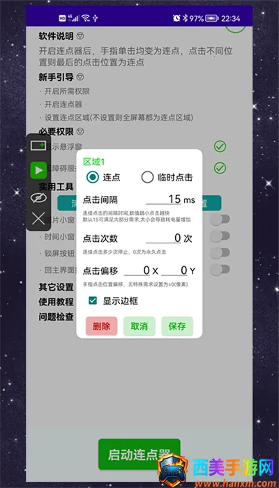 手动连点器是一款超实用的安卓连点工具,可惜苹果下架了。它适合需要频繁切换点击位置的游戏或应用场景。只要点一下,就能在哪连点哪,还能自定义连点区域、点击频率与次数,操作灵活不打扰原本使用。它基于安卓辅助功能,免ROOT就能模拟点击手机屏幕。能批量进行自动化测试,协助有障碍人员使用手机,一键触发连续点击动作。比如玩一些需要快速点击的游戏,它就能帮你轻松实现,释放双手。还附带图片小窗、时间小窗、锁屏按键等小工具,让体验更上一层楼。首次使用授予显示浮窗和无障碍服务权限后,就能在屏幕上自由连点。实用工具栏支持开启多种功能,辅助操作更便捷。区域设置可自定义点击区域等,满足各种复杂场景需求。